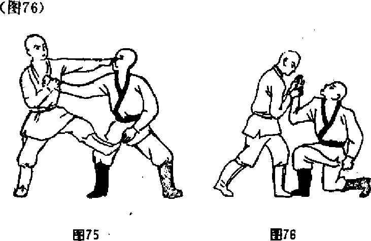 26插版裆甲右手擒住乙的右手在胸前不放疾出左手插乙的双眼同时抬左脚踢乙的裆部。(图75)