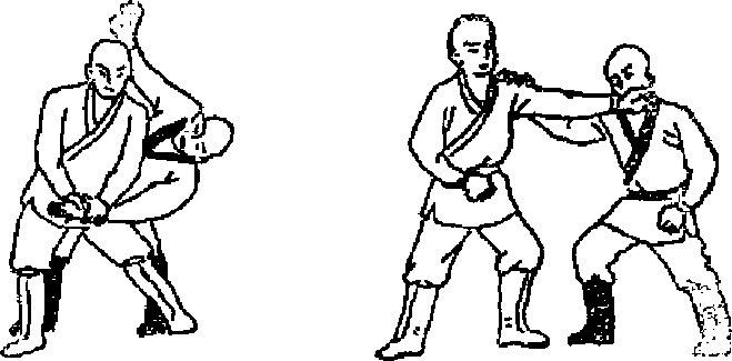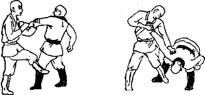 (2)向左转左脚插或乙右脚后绊住乙右脚同时左臂屈肘,用肘尖猛顶乙胸脑立(图85)