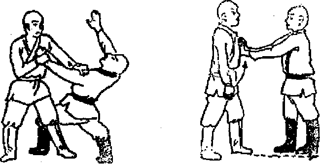 (2)乙左手抓甲胸部甲速用右手抓住乙左手左手压乙左肩左脚往乙左脚后边插,接着左腿用力后扫口(图81)