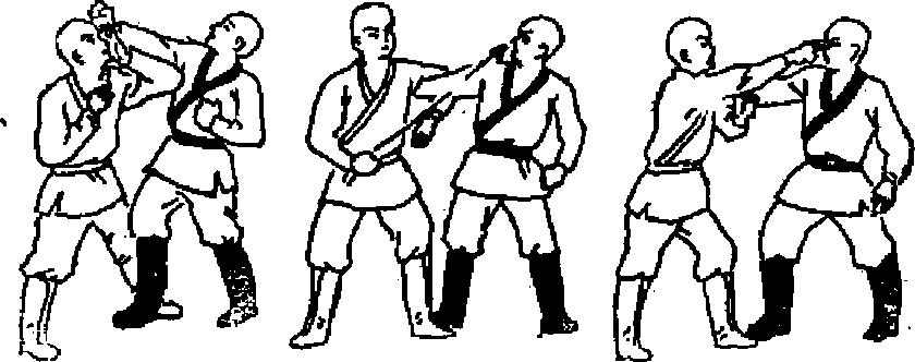 (3)急速向左转身同时出左手横扫掌击乙颈部,乙仰身避开甲左掌越过乙颈后突然屈肘向下绕过乙的右臂后