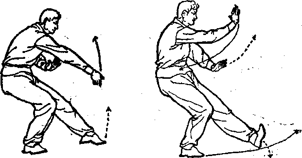 ①体向左转,右腿微屈,左腿提起随即以脚尖点地,成全虚 步。同时,右拳变掌,由上向前叼手下沉回拉,以小指、无名 指、中指用劲,再由上向前下插,左拳变掌,随右掌由上向前叼 手下沉回拉后微挑,贴靠于右肘内侧,掌心向右,左大臂靠肋 (图231)。②右掌上挑成立掌,掌心向左。同时,左脚脚尖藤 起,左赃伸直随挑掌微向上拾。左掌位置不变。体面向东,目视 前方(图232夂 231 232