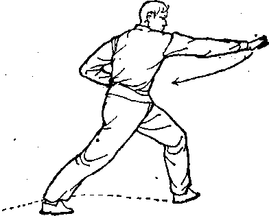 右腿向西撤步摔蹬,左腿屈膝,左脚尖外捩,成弓步。同 财,左拳外旋拧转回拉,左臂贴胸靠肋;右拳外旋微&,翻成阳 拳,再从左小臂±内旋下沉拧钻打出,与肩平高。左拳回拉,右 拳前打,两拳同时进行,协调配合。体面向东,目视前方(图 239).明233