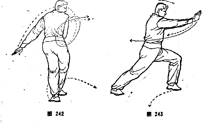 ①右脚外撇向北上费?同时,左臂屈肘后,两掌向左后下沉叼拉。左臂斜下伸,右臂 贴胸靠肋(图242)。②左脚经右脚前向东北上步,左腿屈膝,右 艇蹬直,成左弓步。同时,两手由上向前下搭,叼拉后再上引向 前推出,与肩平高,两掌心相对,指尖向上成立掌。.体面向东, 目视前方(图243 )。