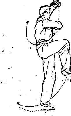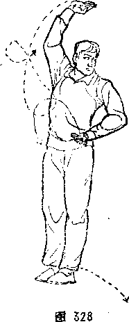 右脚向左后撤步,体向右转,左脚向右脚并靠,两腿直立。 同时,右拳变掌向右下、右上划弧,右臂徼屈肘架于头右侧上方, 掌心向上,掌指向左;左臂外旋下落,屈肘抱肋,学心向上。 体面向西南,目视东南(图328 )。
