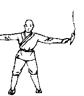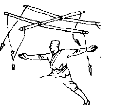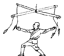在一间屋里二边高悬横木数根用绳或铁链吊起两口尖刀(刀长6寸上面有两刃一尖后把上有眼和一个小环系绳吊在上面的横木上)刀下面高与人胸平齐刀尖向下练习用手拨打经过半年时间方可以拨得利索打不沾身。(图376)