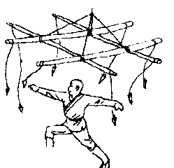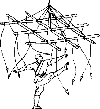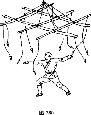 7在上面橙竖交叉的横木11吊着匕、中,下二层高矮、长短不同的吹毛利刀,练功者在里面用前后左右拨打、踢击、肘拐、头碰等方法把刀子拨动得来回摆动不停身子在里边闪展腾挪行南就北蹿跃蹦跳14口刀不沾身练功者也不觉费力口要练16个年头方可将近成功。(图382