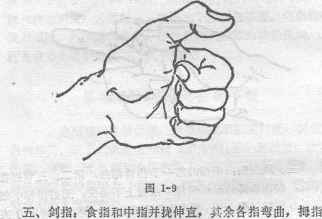 按敌身体薄弱处的穴位。压在无名指的指甲上(图1-10)。要求中指和食指用力并紧伸直手掌成空心用中、食指两指尖点击敌各要害穴位。图1-10