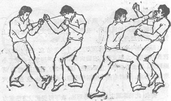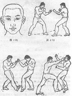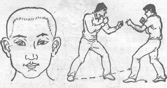 别名眉中。类别属奇穴。位置在眉毛正中眼平视下对瞳孔处(图4-2解剖在眼轮匝肌中有额动、静脉分支。分布有眶上神经、面神经分支制敌点穴法敌、我双方左格斗姿势站立(图4-22)。我重心前移左腿支撑右腿向前摆出用脚掌攻击敌左小腿胫骨敌重心后移左腿退防(图上23)。我右脚向前落地或右弓步。同时右拳变金刚指手型向前点击敌鱼腰穴要点此动作属主动攻点的招法,攻下时要把敌方注意力引向下方快点头穴,较易成功°图4-鹿入图4-21 图4-22