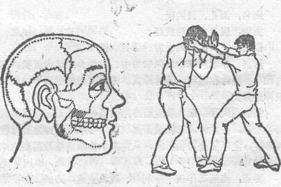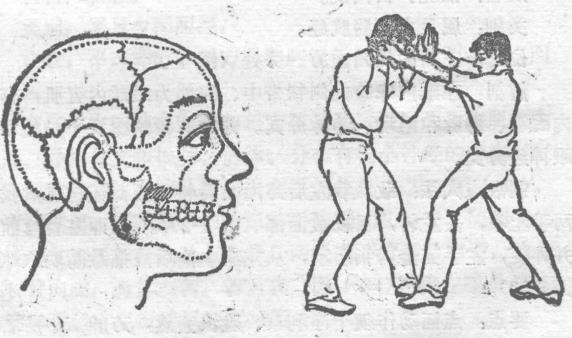 制敌点穴法敌用两手从左右两侧进攻我两耳部时,