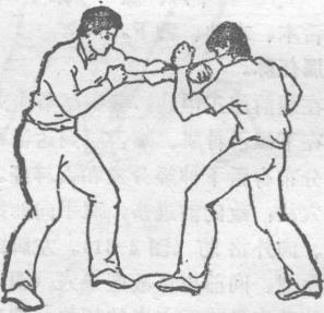 类别属手少阳三焦经。位置耳垂后乳突和下颌骨之间的凹陷处(图4-57)。解剖,在腮腺后缘、乳突和下颌支的中间有耳后动脉,分布有耳大神经该部皮下有颜面神经的耳后支通过。制敌点穴法我用左拳进攻敌胸部敌用左臂向右格防(图4-58)。随即我左脚向前进步同时右拳变金针指手型向前点击敌左翳风穴(图59)要点两臂动作要迅速、连贯点击时要抓住敌向右格图47 防的时机。