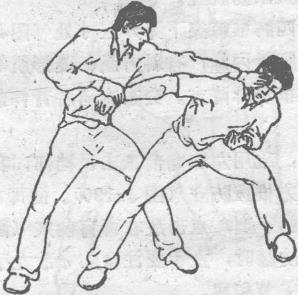 (图4-187)。我右手松开敌右臂变金针指手型点击敌右胃仓穴(图4-188)。