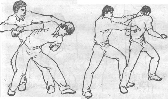 攻我头部时我右手向右刁抓防守(图4-180)。左脚向前上步左手向前推抓敌面部右侧迫使其身体左倾(图4-186)上动不停,我左手用力向左下方拧转敌头使敌左转