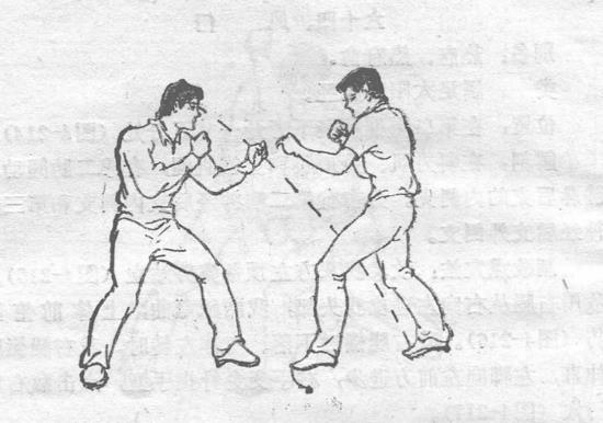 制敌点穴法敌、我双方左预备姿势站立(图4-215)。