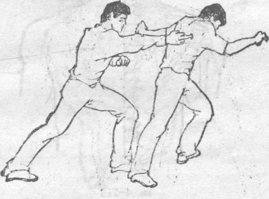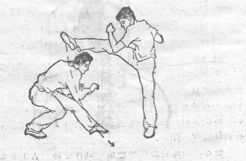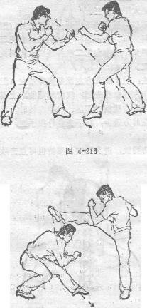 敌用右腿从右向左进攻我头部我两腿弯曲上体前俯闪防(图4-216)。敌右腿摆过下落、身体左转时我右腿挺膝伸直左脚向左前方进步右手变金针指手型点击敌右风门穴(图4-217)。