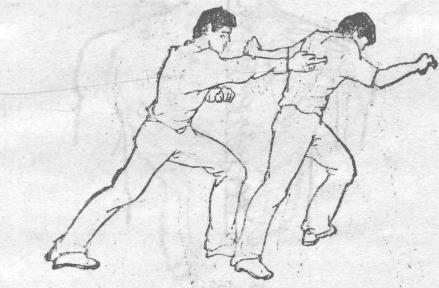 类别属足太阳膀胱经。位置在第九胸椎就突下旁开一寸五分处(图4-218)。解剖在背阔肋、舐棘肌和背最长肌中有第九肋间动、静脉后支的内侧支。分布有第九胸神经后支内侧支。深层为第九后支外侧支。 、制敌点穴法敌、我双方左预备姿势站立(图4-219)。我左脚外展左腿支撑身体左转。右脚微提离地从右横向左勾踢敌左踝关节处使之失去重心(图4-220)。敌摔倒后欲爬起时我立即靠近敌体左手变鸦嘴拳手型点击敌右肝俞穴(图4-221)。要点勾踢时脚跟稍擦地,动作要快点击要狠。图4-217