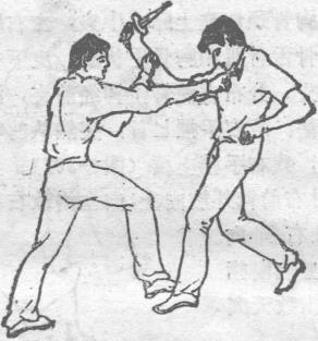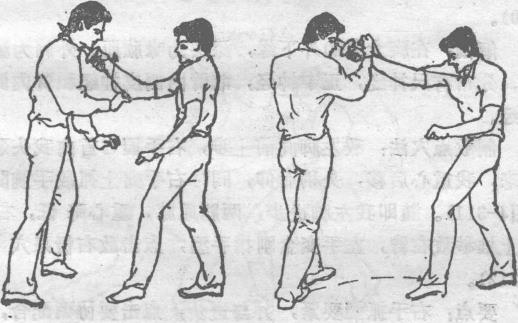 4-308)随即右脚向前上步右拳变金刚指手型向前点击敌天突穴(图4-309)。