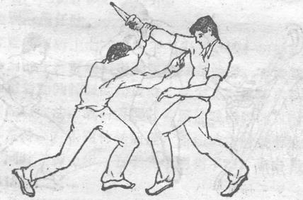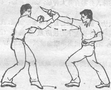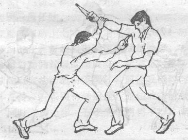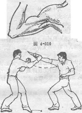 二类别属手少阴心经。位置举臂开腋、在腋窝中间腋动脉内侧(图4-310)。解剖在胸大肌的外下缘深层为喙肱肌。外侧为腋动脉。分布有尺神经正中神经前臂内侧皮神经和臂内侧皮神经。制敌点穴法敌左脚向前上步右手握匕首向我头颈部刺来我重心后移头稍后仰同时右手向上抓敌手腕防守(图随即我左脚进步两腿屈膝重心降低右手向上推举敌右臂左手变金刚指手型点击敌右极泉穴(图4-312)- 要点右手抓握要紧并与进步,点击要协调配合要勇敢果断整个动作一气呵成。图4-310图4-311图4-311