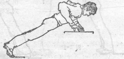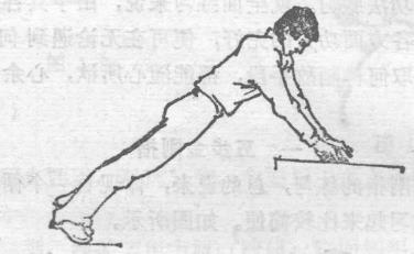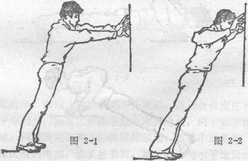 五步金刚指的练习总的说来体现着一个循序渐进的过程且练习起来比较简便。如图所示。第一步练习者立于墙前身体与墙的距离要超过手臂,之长。动作是两臂向前摆起伸直垂直于墙面两手与扃同 , 、 , - 宽十指分开撑在墙上(此时十指尖为着力点以下均同)而后做屈伸运动。要求数量可由少到多(图2-入2)。第二步通过第一步的练习达到指力有增加而后取材一木凳之类两手的手指撑在凳上(指法与上同)两臂伸直身体挺直与地面约成45°角做屈伸运动(图2-3、4)。-图2-3