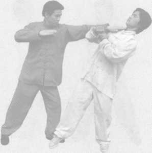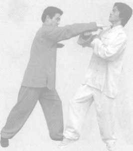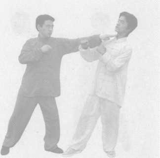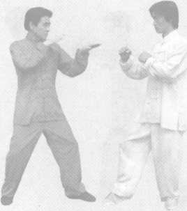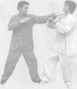 (3)跟踪追击, 再用“灵蛇寻穴刺 喉势”,右蛇信掌 连打敌咽喉。(图 2 - 104)