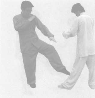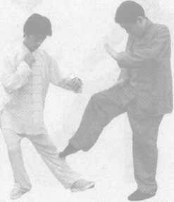 连环脚踢法,指单纯用脚,放长踢远,力大劲沉,顺势连 击,急打猛攻,犀利难挡。1.迎腿连镖实战应用:(1)左势对 敌。(2)我见机速 进,先用“小腿暗镖 正踢势”,左脚急 踢敌小腿迎面骨。(图 2 - 134)图 2 - 135(3)跟踪追击, 再用“小腿暗镖正 踢势;右脚连踢 敌腿面骨。(图 2 - 135)图 2 - 135图 2-136图 2 - 137图 2-136图 2 - 137