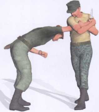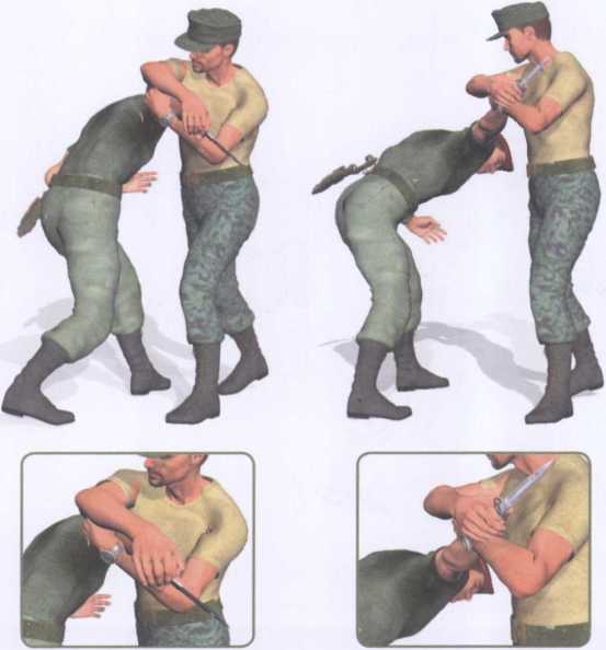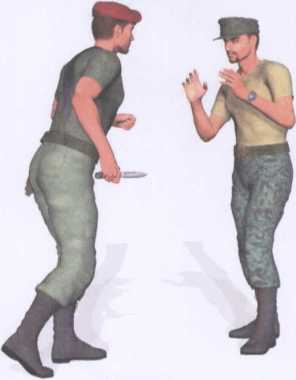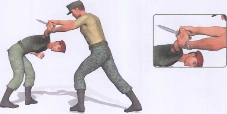 双方交手对手右手正握短刀由我正面进攻自下而上实施挑刺(图4-2-10)