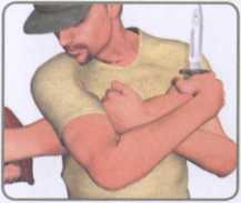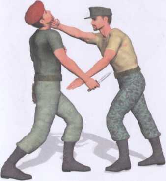 双方交手对手右手正握短刀由我正面进攻自下而上实施挑刺(图4-2-10)双方交手对手右手正握短刀由我正面进攻自下而上实施挑刺(图4-2-10)在短刀迫近的一刹那我迅速伸出左臂以小臂尺骨为力点向左侧下方阻格对方右小臂腕部同时右手顺势向前伸展以右拳拳面和拳峰直击对方下颌或者面门(图4-2-11)在短刀迫近的一刹那我迅速伸出左臂以小臂尺骨为力点向左侧下方阻格对方右小臂腕部同时右手顺势向前伸展以右拳拳面和拳峰直击对方下颌或者面门(图4-2-11)