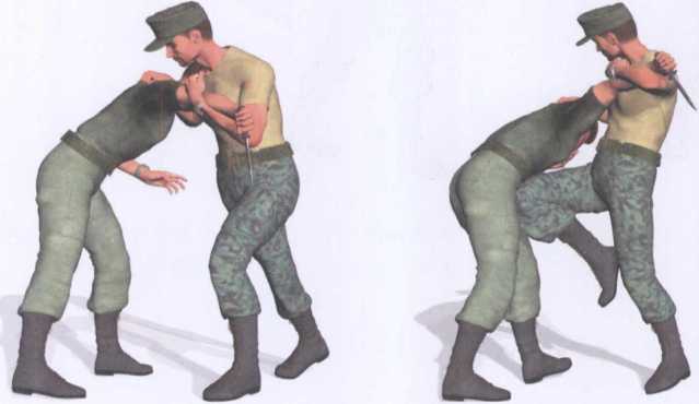 动作不停身体重心向前过渡左脚向前逼近左臂顺势内旋向前上方屈肘圈揽对方右臂左手扣腕牢牢控制住对方右肘关节外侧令其右臂紧紧贴靠于我胸前右手配合抓住其右肩头用力向怀中拉扯对方上体迫使其尽量靠近自己旋即右腿迅速屈膝提起以膝盖为力点向前猛撞对方裆腹部(图4-2-12、图4-2-13)