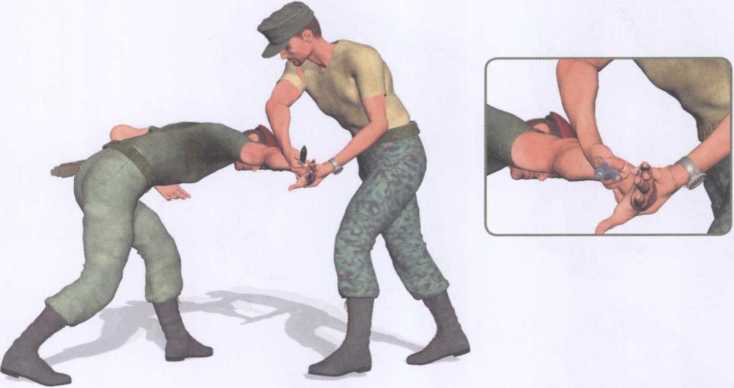 继而在对方右手放松对短刀刀柄握持力度的瞬间我右手顺势将短刀刀柄由对方右手心中抠出、攥住抢夺过来(图4-2-18、图4-2-18特写)