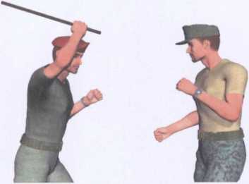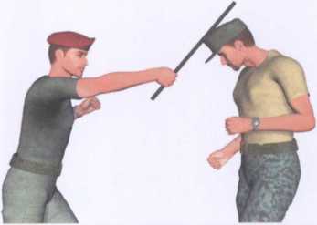 挥舞短棍自上而下朝正前下方劈击对手头部(图5-1-1、图5-1-2)