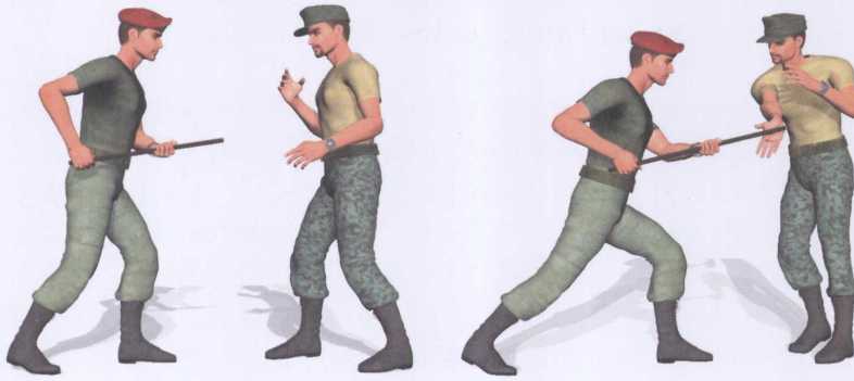 对方双手握持短棍快速逼近(图5-2-10)对方双手握持短棍快速逼近(图5-2-10)对方以短棍前端为力点直戳我腹部我迅速向右侧闪转身体避让的同时伸出右手拨挡短棍前端(图5-2-11)对方以短棍前端为力点直戳我腹部我迅速向右侧闪转身体避让的同时伸出右手拨挡短棍前端(图5-2-11)