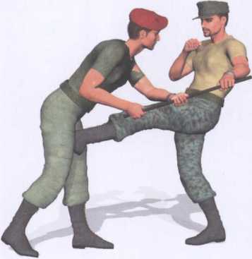 旋即用右手牢牢抓住短棍前端并飞起左脚猛踢对方腹股沟(图5-2-12)