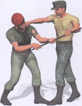 对方以短棍前端为力点直戳我腹部我迅速向右侧闪转身体避让的同时伸出右手拨挡短棍前端(图5-2-11)