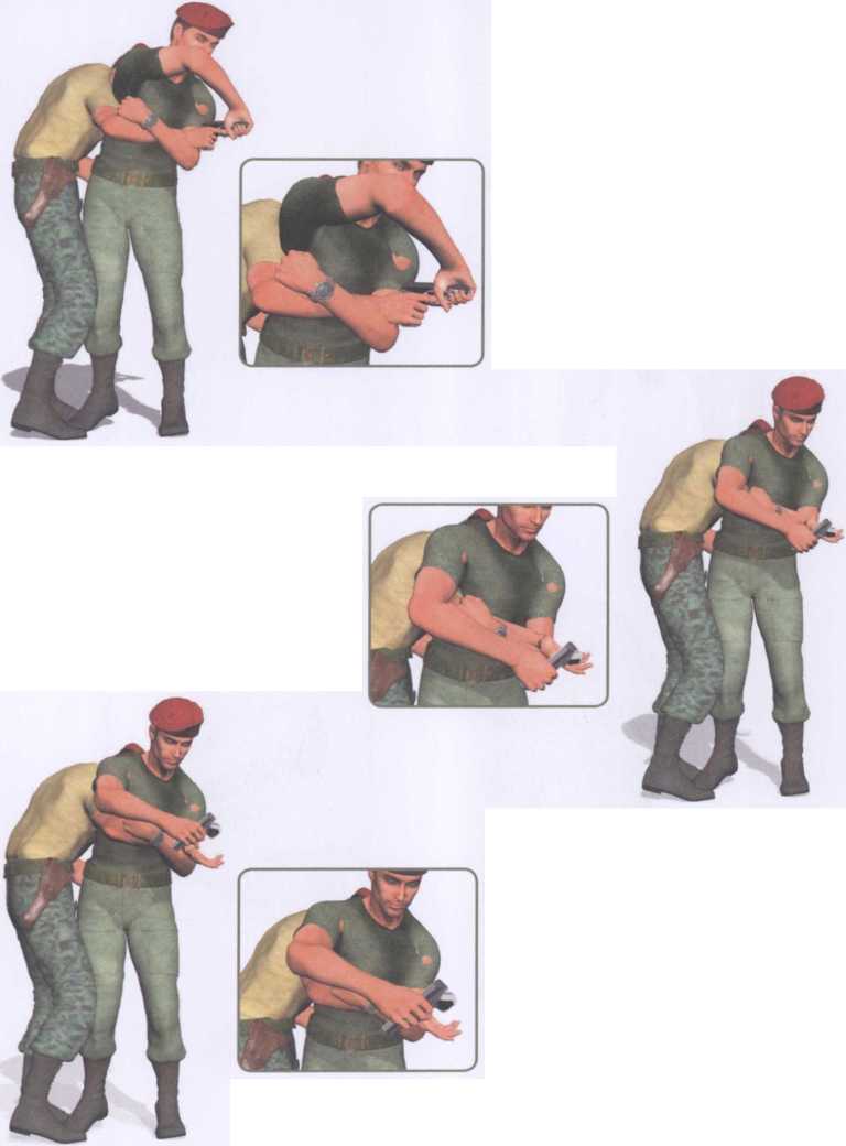 ?左臂夹紧对方右臂肘右手用力向右下方扳掰可迫使敌人放松对武器的握持(图6-1-21、图6-1-21特写)