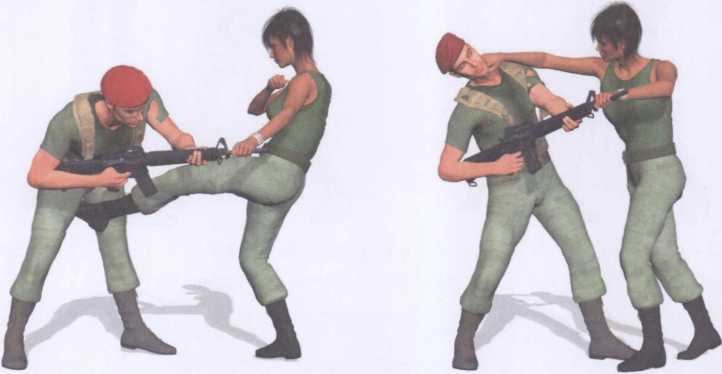 旋即飞起左脚连续踢击对方腹股沟或者挥舞右拳连续击打对方头部(图6-2-4、图6-2-5)