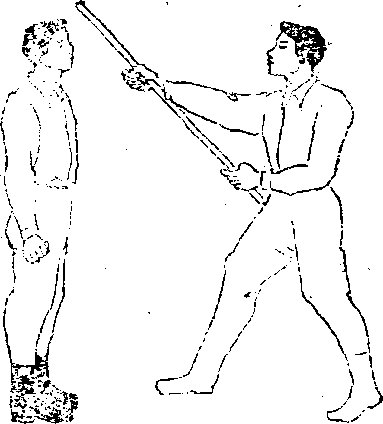 1敌人持木棍宕手抓握棍中左手握住棍梢从上往下劈打军警的头部(图5—31)