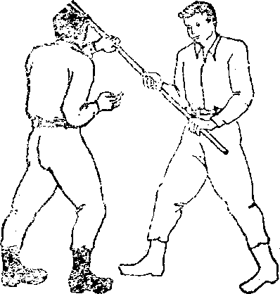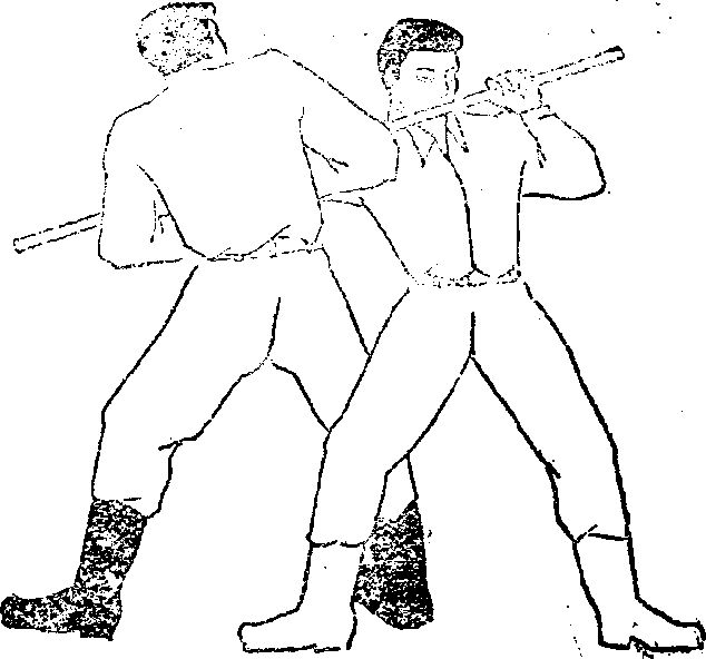 2军警向敌右侧上右步闪过敌棍右脚位于敌人右脚内侧脚尖微往里扣,重心落在两腿中间同时左手臂弯屈拇指朝下掌心朝棍五指迎抓敌棍(图5—32)