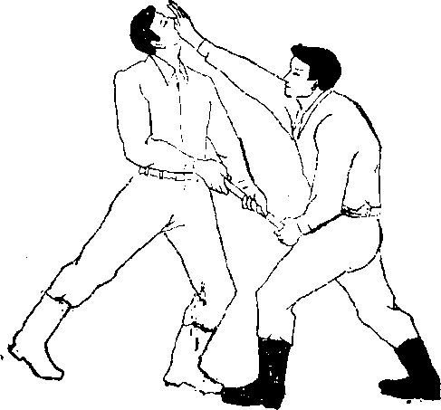 2,军警左脚向敌正前方上步位于敌左脚的脚尖前数厘米处身体侧尽同时左手速抓住敌棍中部向左后按压右掌糖出佣掌根部猛击敌人下颌(图5—35)。