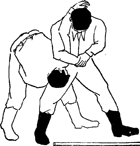 自己位于敌双脚前宜迅速往后扫敌腿。因为敌人只要出右手抓我右脚踝即可解脱我锁臂擒拿。如我右脚置于敌右脚后敌人就难以解脱。而军警要压倒敌人只须用右膝猛抵敌右膝窝就可轻易而举地将敌人压倒(图5-36)