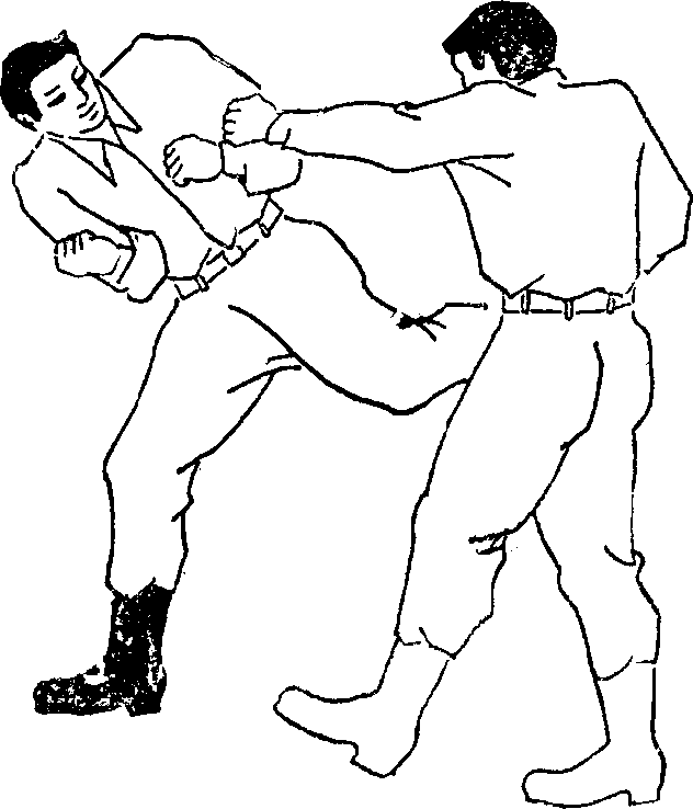 图3—1动作要领1敌左直拳攻击军警军警起左腿撩敌的裆部以阻敌进攻(图3—1)图3—2羊2军警左腿落地进身、拧腰左臂屈时向前猛顶敌的心窝(图3—3)。3,上动不停左转身起右膝猛撞敌的裆或腹部并以右拳击敌面部(图3-3),留3—3要点动作连贯、有力。简析泰国十分重视肘、膝在贴身格斗中的作用。此招动作特点明显组合紧凑、科学。军警左腿阻敌殍成侧敌的石利格斗架势。敌受踹后上体必然前倾军警左脚落地后顺势肘击如这招落空立即顶膝并用拳打击面部效果再不理想可改为右肘下击敌后脑或后心这样杀伤力更为可观。