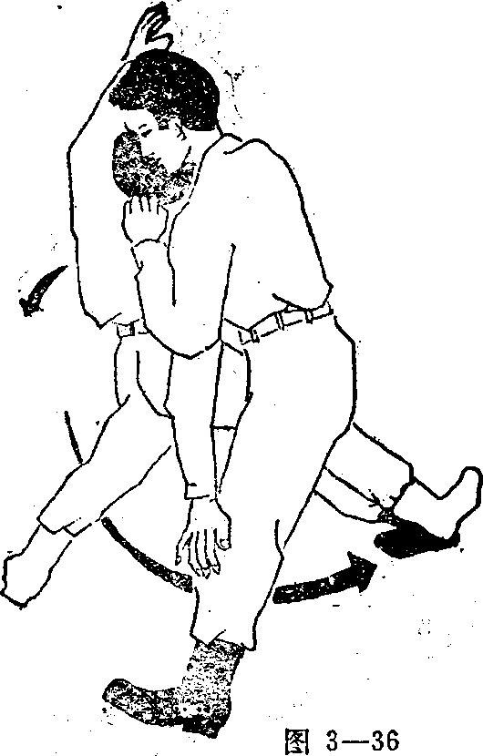 图3—34动作要领1军警突然跨出左脚置于敌人右脚外侧双掌跟猛击敌双肩并抓住其衣服(图3—34)0 图3—352两手继续抓住敌肩身体前移重心置于左脚右脚向前成弧形(图3—35)。3右脚猛地向下启方摆动以小腿部猛力击敌小腿在击中敌右腿的同时猛推敌眉将其摔倒接着猛击敌要害(图3—36)