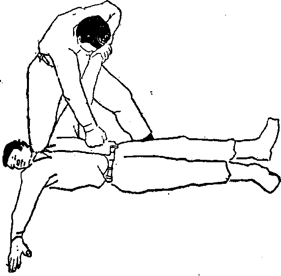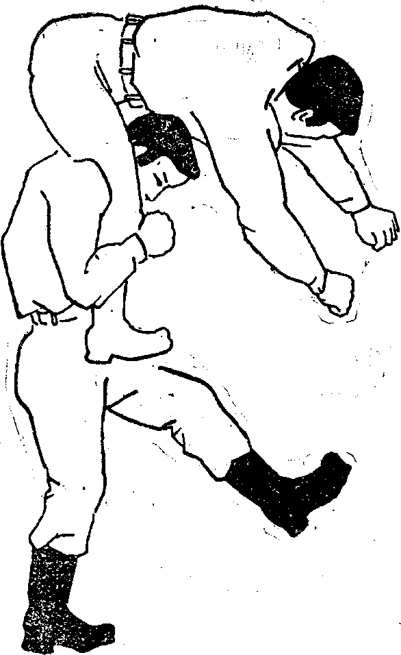 将敌右腿置于右肩左手用力往下扳压敌人脚背(图3-120)图3—1213 上动不停右脚掌蹬地身体直起人往前倾,将敌从头部摔出(图3—121)4图3—1224 敌人倒地后随即右膝跪压敌人帼喉左手抓拉敌入左手右拳由上往下腕部与拳而绷成直线猛力击打敌人的胸腹部(图3-122)。要点闪躲快抱腿准转体、扛腿、摔敌动作一气呵成跪喉击腹要狠。简析此招适用丁对待擅长高腿法的敌人。