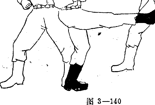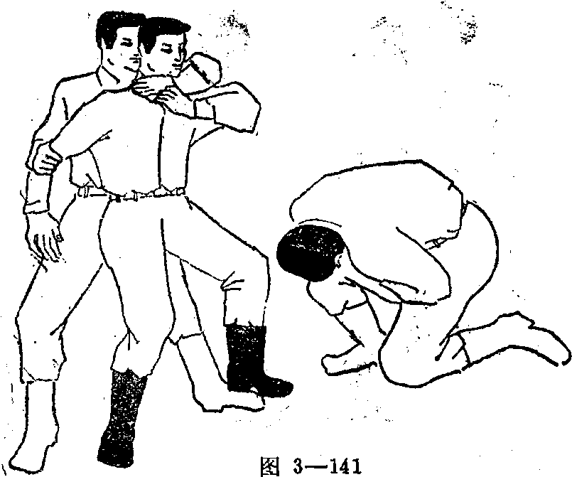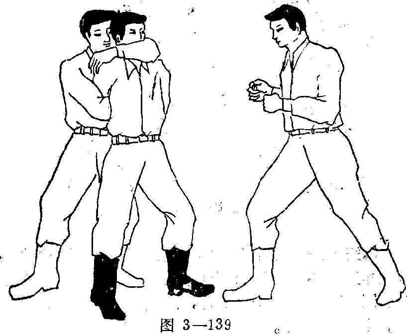 2军警利用身后的敌人保持平衡并支撑身体虽然喉部依然被敌所制左手被敌扳直右手又要拉敌锁喉的小臂但有胃后的敌人作依托有利于踢弹正面敌人对准逼近的敌人腹裆部以致命的弹踢(图3-140)0