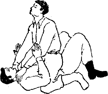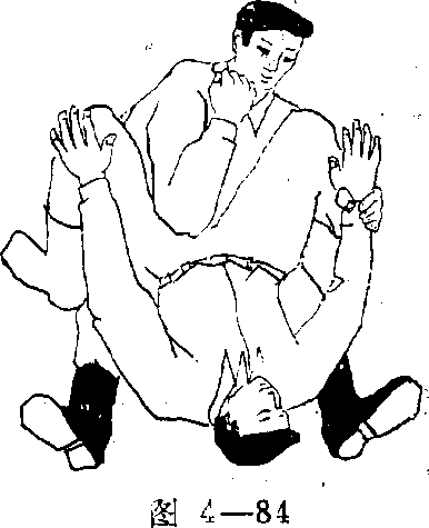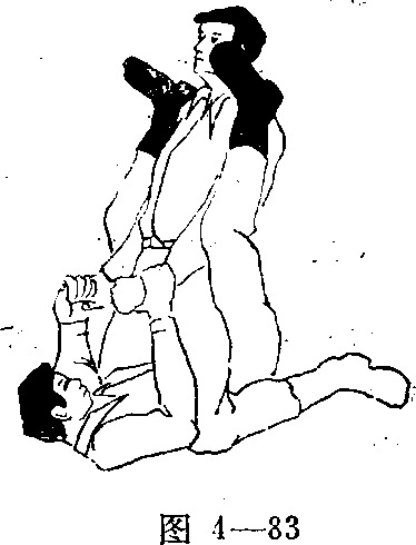 3, 上动不停右手抓握敌说左手折敌手指双腿向上别缠敌人双肩压(4—83)