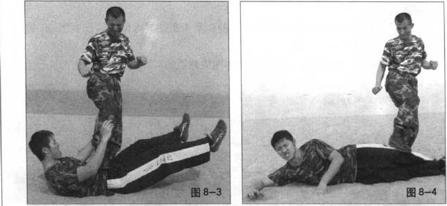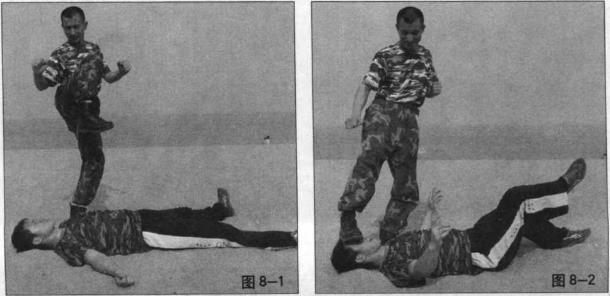 当敌方倒地后我迅速向上提起膝蓄力(图8-1)然后再用脚后跟狠狠向下踹向敌方头、面部要害处(图8-2)