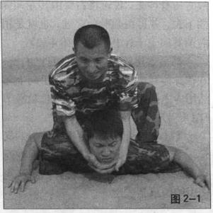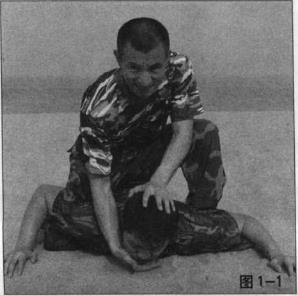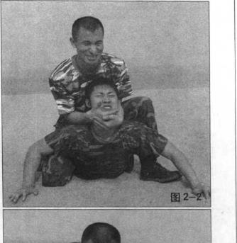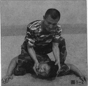 当敌方倒地后我迅速骑压于其背上并用左手向下按住其头同时用右手向下拉(扳)住其下巴(图1-1)