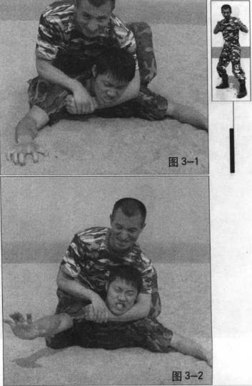 当敌方倒地后我迅速骑压于其背上并将左臂由敌方颈下穿过而用左前臂向上卡住其喉节(图3-1)