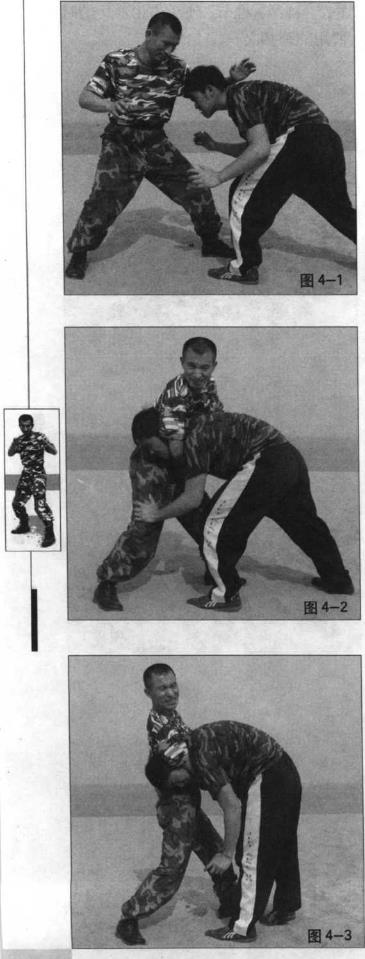 敌我双面对面对峙(图4-1)敌方俯身冲来我速将右臂由其左颈侧插下去并再由其喉前穿过也就是用右前臂向上卡住其喉节(图4-2)