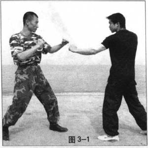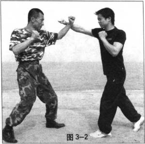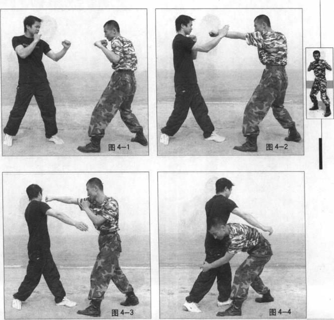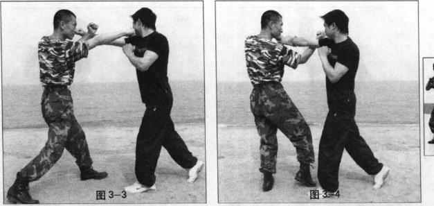 敌我双方以格斗式对峙(图4-1)我迅速用左直拳向对方面部发起攻击(图4-2)接下来是右直拳连击摧毁其防线(图4-3)