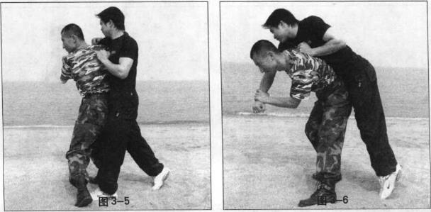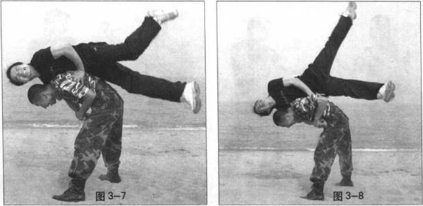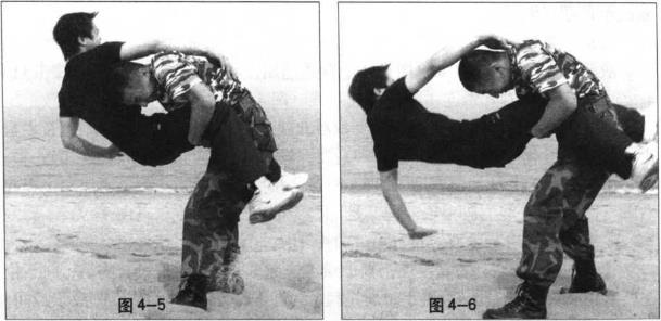 乘敌方抱头防护之际迅速潜身抱敌双腿(图4-4)重心猛然前倾及右肩用力前压将敌方凌空抱起(图4-5)将敌方重重摔向正前方(图4-6)