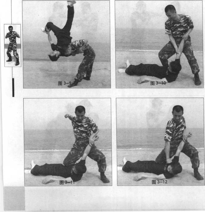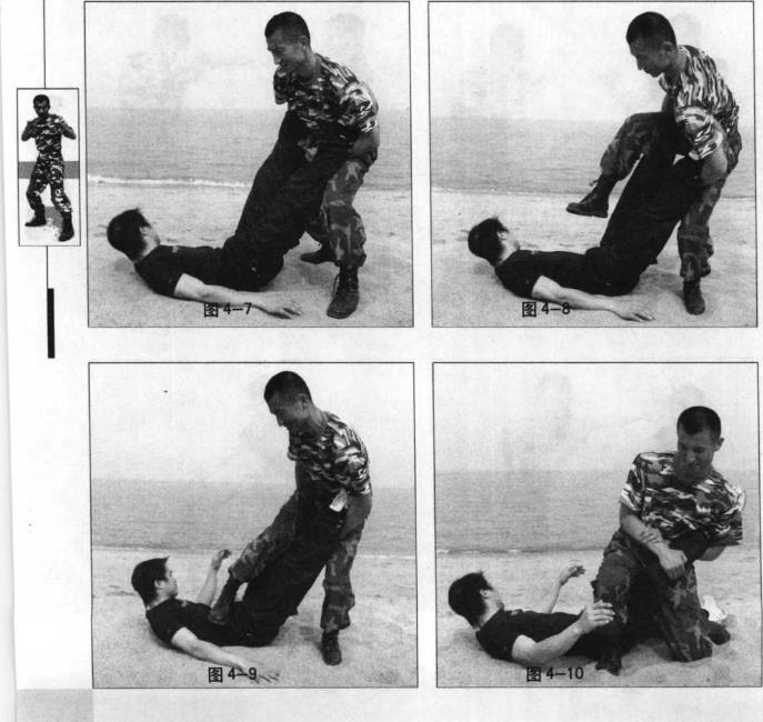 使敌方背部着地摔倒在地上(图4-7)在抱牢敌腿的基础上迅速向上提起右脚(图4-8)将右脚狠狠踩向其裆部予敌以致命性重创(图4-9)